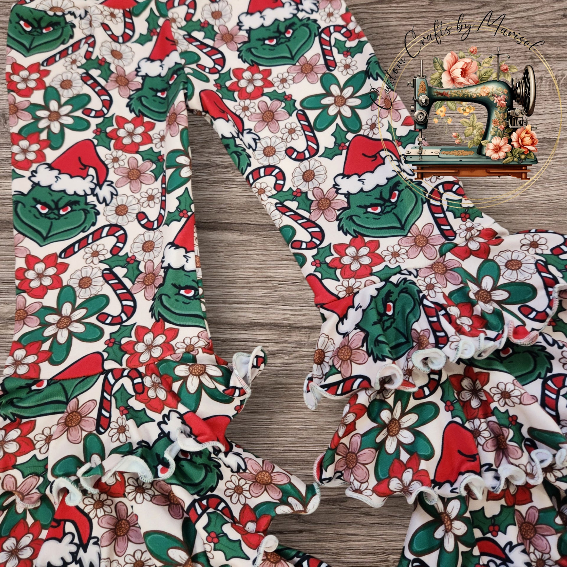 Made from soft and stretchy double brushed polyester. Yoga style waistband. Lettuce hem detail on each bell. Fun and festive!